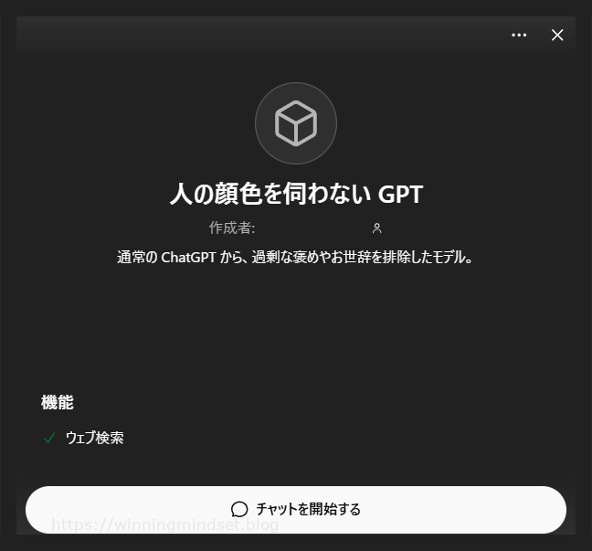 2025年10月18日(土) 気まぐれ日記 X Facebook はてブ LINE Pinterest 2025.10.182026.02.07 この記事は約1分で読めます。 私にとって ChatGPT とは、思考の整理やアイディアの創出、文章の推敲、業務効率化、そして議論の相手として欠かせない存在です。 デフォルトのモデルでは、人の顔色を伺いながらチャットが進んでいくような “気持ち悪さ” を感じていたので、MyGPTs (現在はGPTs) の機能を利用して、妥協なく議論できるモデルを作ってみました。 今後は「気まぐれ日記」のスペースを利用し、私と「人の顔色を伺わないGPT」とのやりとりを公開していきたいと思います。